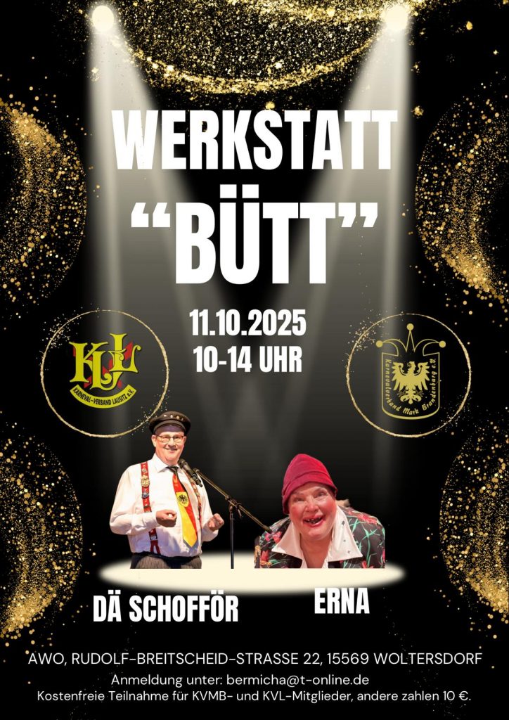 Die Werkstatt „Bütt“ lädt alle Interessierten ein, gemeinsam mit „Dä Schofför“ und „Erna“ in die Welt der Büttenreden und humorvollen Darbietungen einzutauchen. Ob Anfänger oder erfahrener Redner – hier ist Platz für alle, die Lust auf Sprache, Pointen und Performance haben.